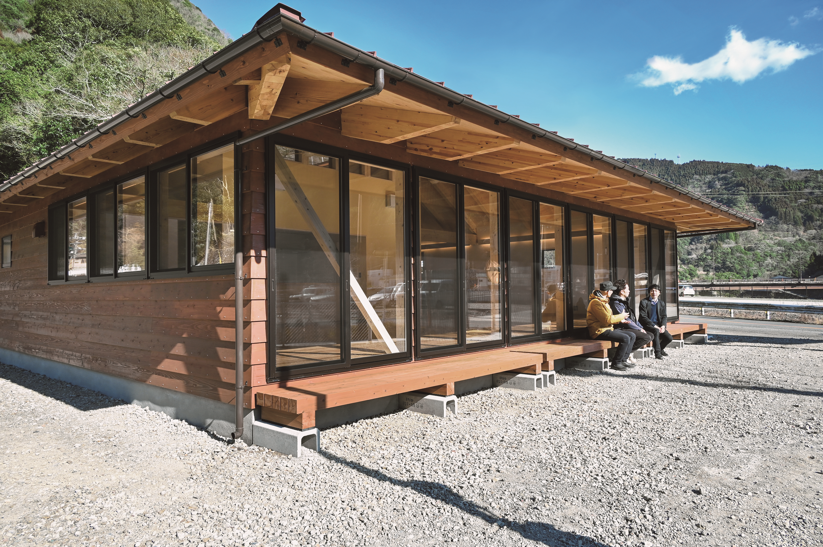 南北に長い球磨村を東西に横断する球磨川に沿った3つの集落に建つ球磨村のみんなの家。球磨川は熊本県南部の人吉盆地から八代海へと注ぐ急流である。球磨村は山が多く古くから林業の盛んな地域である。今でも丸太を積載したトラックが球磨川沿いの国道を行き交い、木材はこの地域の人たちにとって最も慣れ親しんだ地産素材である。球磨村のみんなの家ではしっかりした断面の木材を見えるように多用することで地域住民が誇りを感じる場所をつくることを考えた。球磨川やその支流に沿って散在する集落には山肌に折り重なるように伝統的な屋根を持つ家屋が多く見られ、時代の変化の中にも地域の集落の原型を感じることができる。そこで球磨村のみんなの家では地域の地形や風土と調和させるための手段として典型的な屋根形状を採用し、以前からそこに建っていたような佇まいを持たせている。一方で、屋根にはまとまりを生み出す力があると考え、架構を工夫して屋根のかたちをそのまま内部のかたちとすることで、包容力と特徴のある地域共用の居間空間をつくることにした。公共性のある施設の場合、どのように地域社会に着地させていくかということも大きな課題である。お仕着せの施設とならないように、球磨村のみんなの家では設計時の意見交換や建設時の外壁の色決め、塗装作業など、地域住民との折々のワークショップを介してプランの決定や建設の課程に関わってもらい、体験や記憶を地域で共有することで建物の計画や建設を自分ごとにし、この建築を地域に根付かせようとしている。定期的なメンテナンスが必要な木質の外装も将来的な地域住民の協働の機会となると考えている。