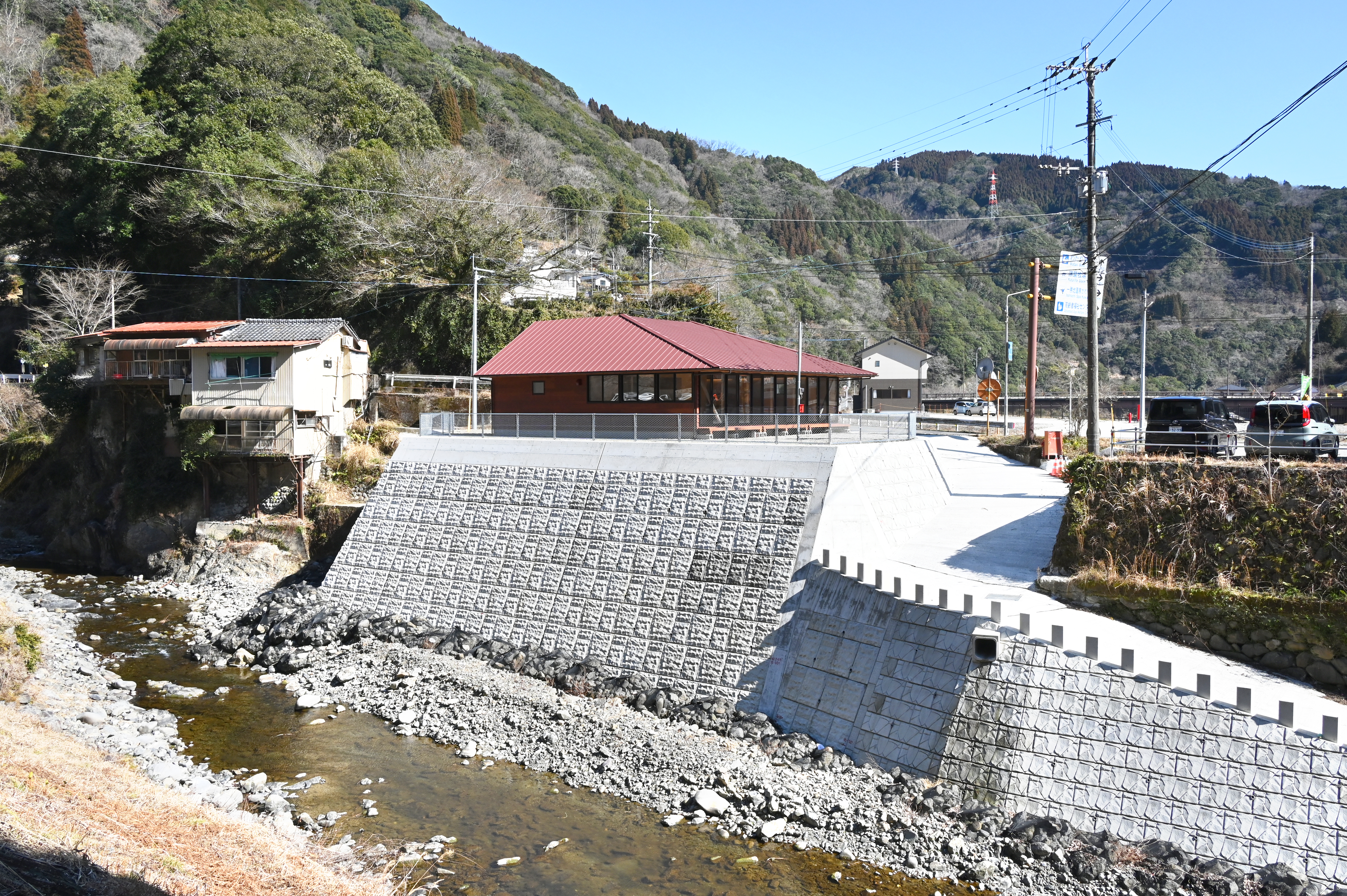 神瀬のみんなの家は土間中心である。敷地は球磨川から支流の川内川に沿って奥に続く神瀬地区の入口にあり、芝生公園、土の広場、駐車場の3つのオープンスペースに面した角地にある。ワークショップでは、イベントの多い地区であることからイベント時のサポートとなるように土間中心の内部と屋根付きの屋外土間を求められた。室内の一部には小上がりの畳スペースを設けている。