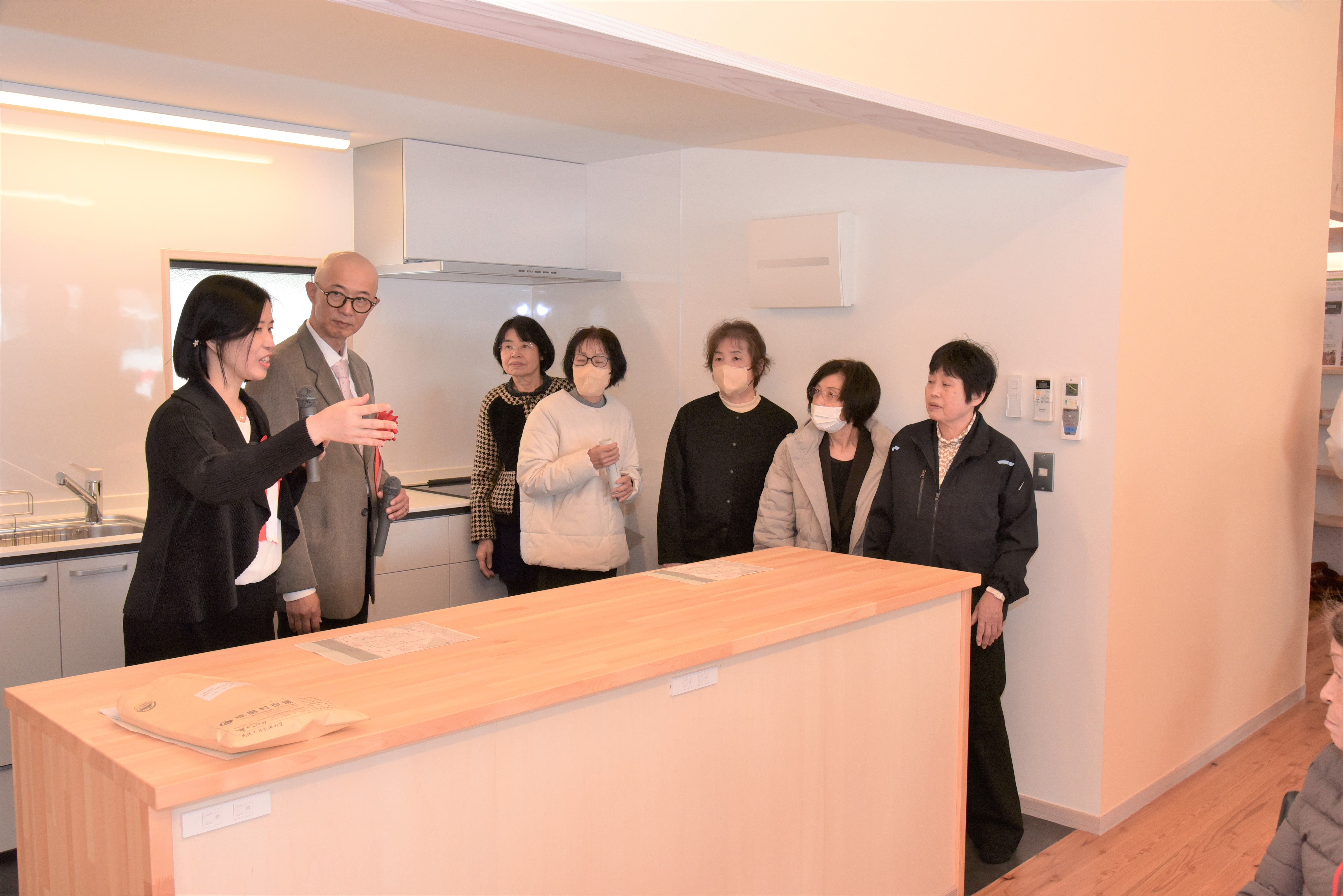 まず設計者の渡瀬さん、永吉さんから「みんなの家の使い方の説明」があり、みんなの家の間取りや使い方の説明がありました。地区の方に間近で見ていただきながら、IHキッチンの使い方や高窓の開け方などの説明をしていただきました。