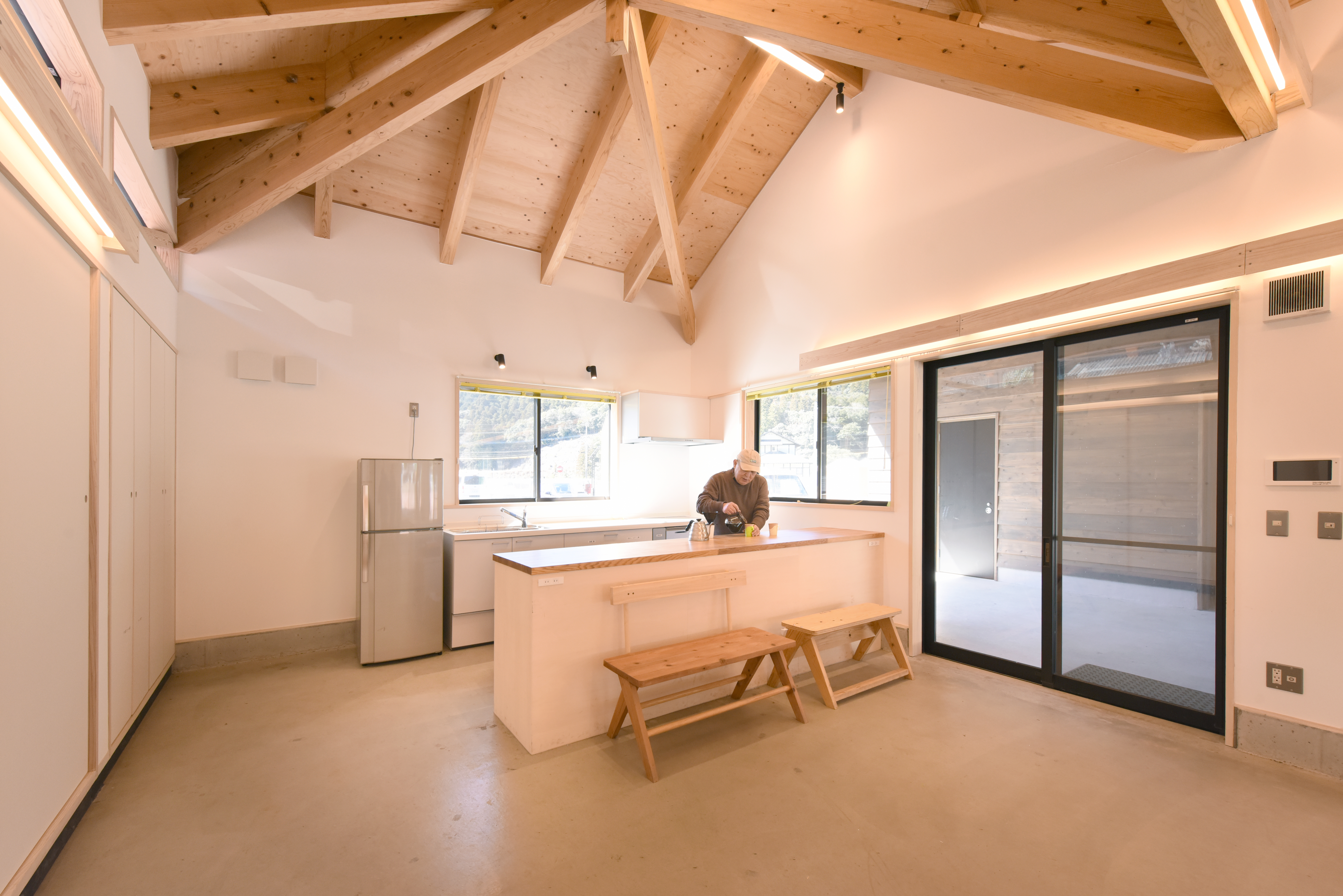 中園のみんなの家はキッチン中心である。敷地は球磨川沿いの国道と支流の中園川に沿った県道の合流地点にある。ワークショップではかつての集落での催しの思い出と、集会場というより住民が集まる場所への要望が多かったことから真ん中にオープンキッチンを置き、それを囲むようにコの字型の居間空間を配置することで気軽に居やすい環境をつくり出している。