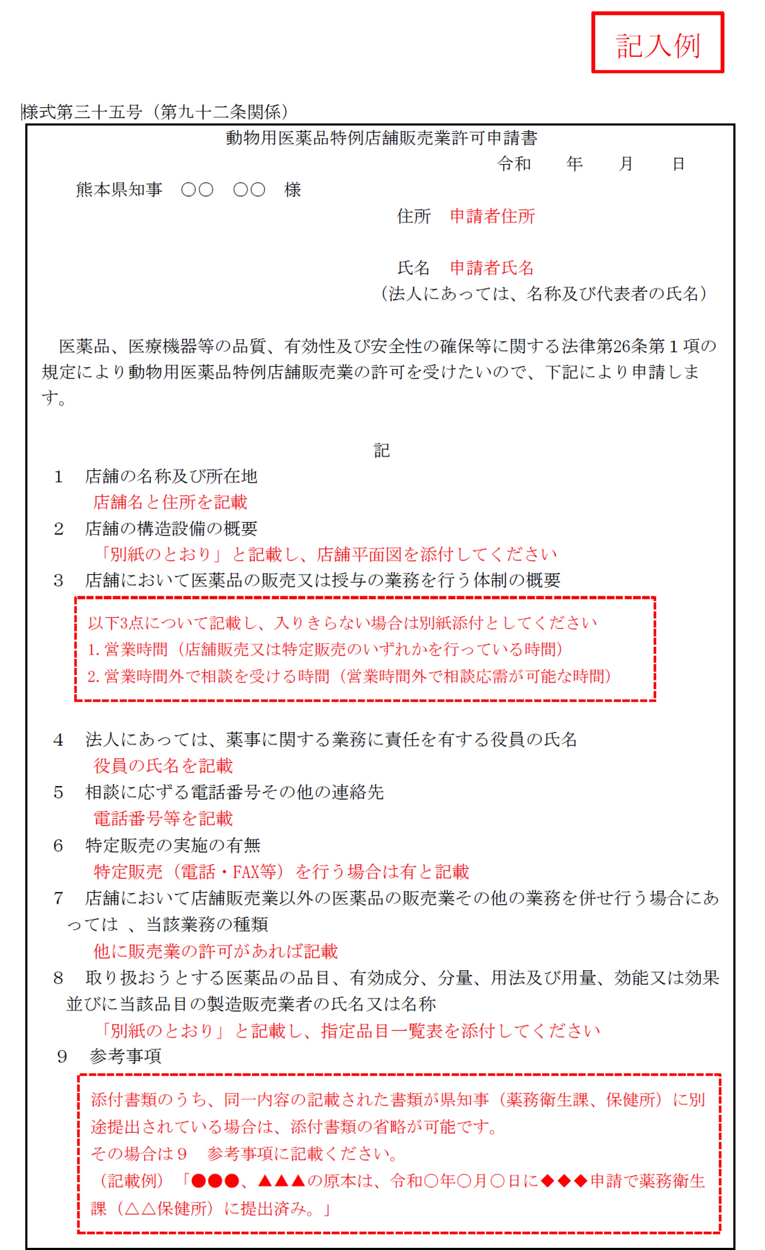 「●●●、▲▲▲の原本は、令和○年○月○日に◆◆◆申請で薬務衛生課(△△保健所)に提出済み。」